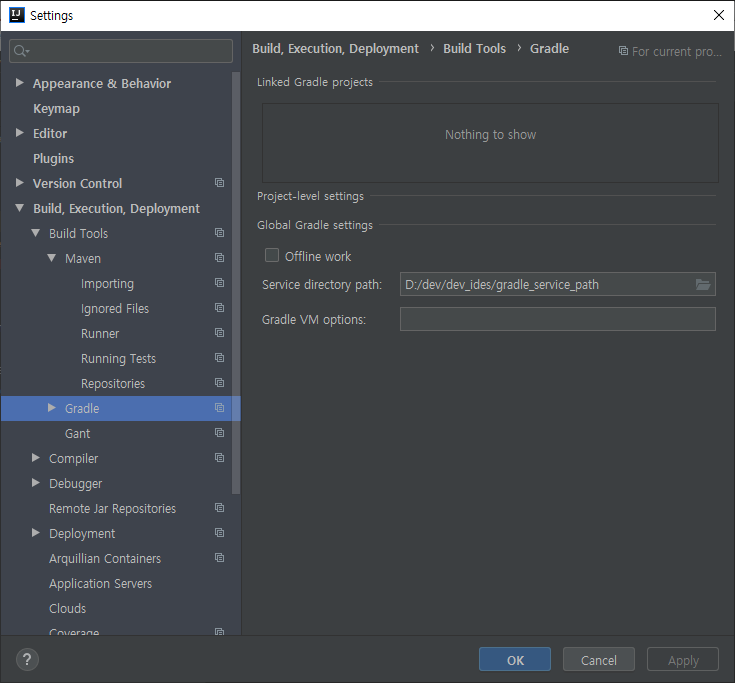 Gradle은 IntelliJ 기준으로 File > Settings > Build Execution, Deployment > Gradle > Service directory path 경로에 찾아가면 Gradle 의 repository 경로를 수정할 수 있습니다. 다른 설정으로도 할 수 있지만 개발 환경에서 이 방법이 가장 쉽고 간편합니다.