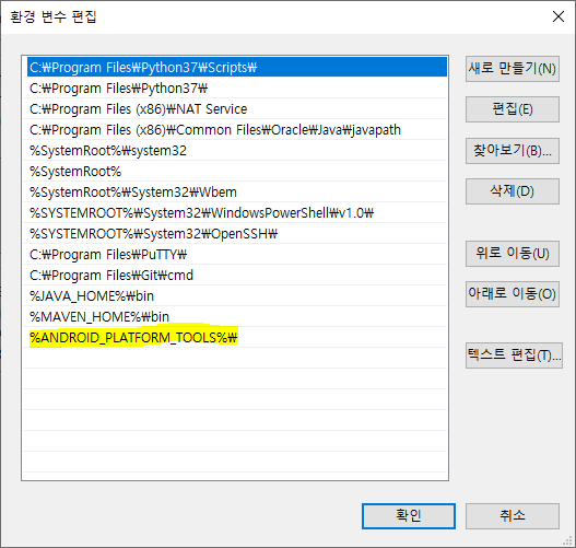 Path의 변수들에 대해서 '새로 만들기' 를 누르고, 아까 Platform-tools 를 입력했던 변수 병을 '%' 로 감싸서 넣어줍니다. 마지막에는 경로를 표기하는 '\'을 넣고 저장합니다.