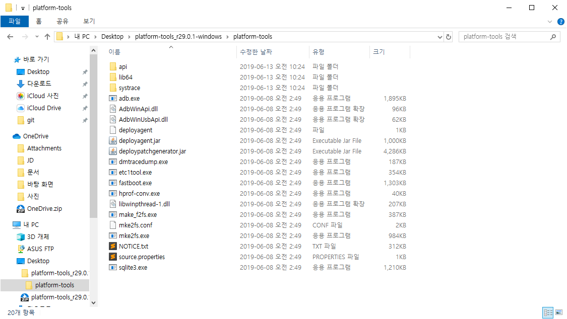 위 링크를 눌러서 나오는 약관 동의 팝업에 Agree 하고 다운로드를 받습니다. 다운로드 받은 파일(예. platform-tools_r29.0.1-windows.zip)을 압축을 해제하면 다음과 같은 형태가 됩니다.