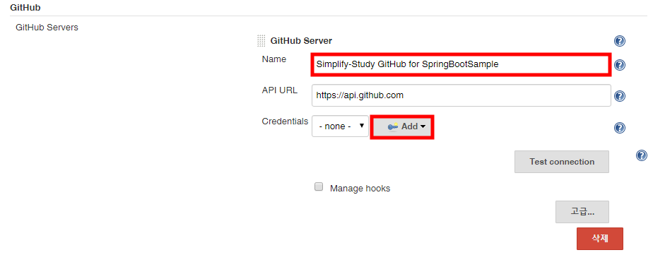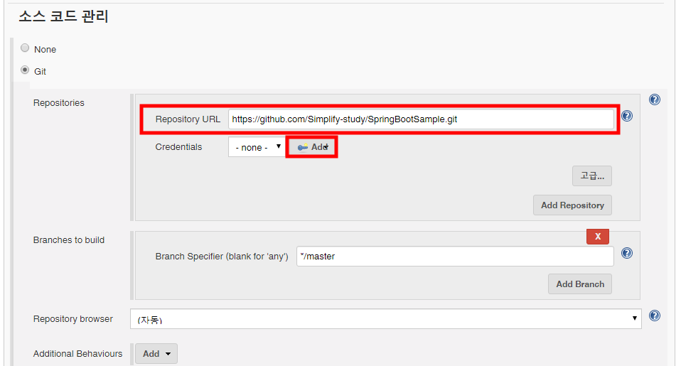 추가한 Credentials 를 선택해주고, 아래쪽으로 내려가서,