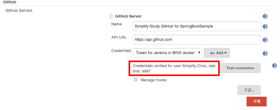 위와 같이 Credentials verified for user.... 문구가 나타나면 정상입니다. 이제 맨 아래에 저장을 누르고 빠져나오면 Jenkins 에서의 설정은 마무리 됩니다.