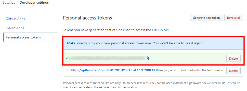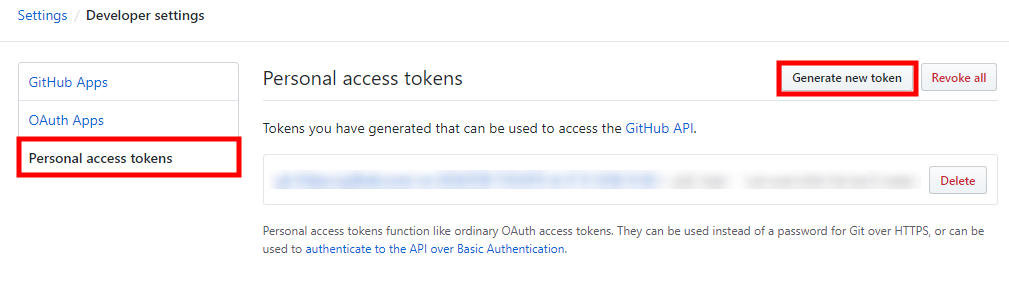 그리고서 Personal access tokens 를 들어가서 Generate new token 버튼을 누릅니다. 저는 기존에 사용하는 token 이 있어 blur 처리 하였으나 아마 처음에는 아무것도 없을겁니다.