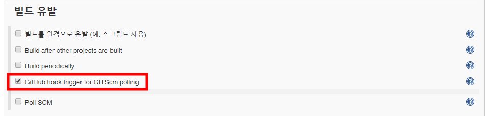 GitHub에 Push 되는 시점에 빌드를 시작하기 위해 GitHub hook trigger for GITScm polling 에 체크해줍니다.