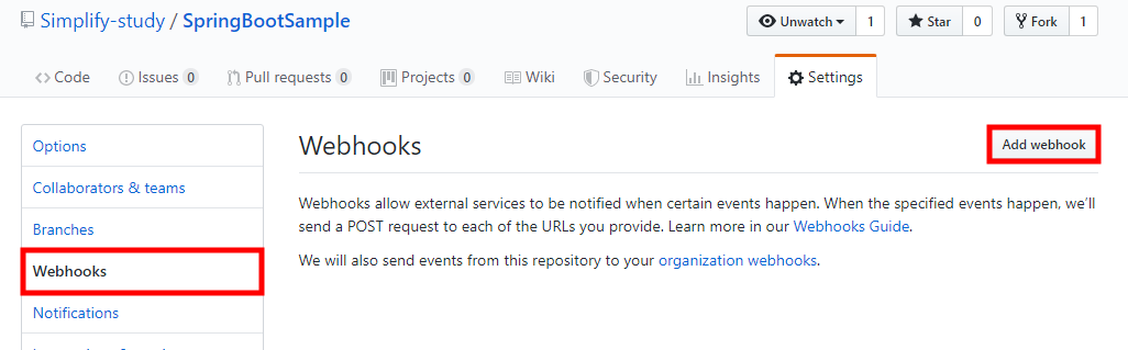 이제 다시 GitHub로 돌아와서, 해당 repository의 Settings 에 들어갑니다. 그리고 좌측 메뉴에서 Webhooks 에 들어갑니다. (Integrations & services 는 구버전입니다.) 그리고 Add webhook을 눌러 추가합니다.