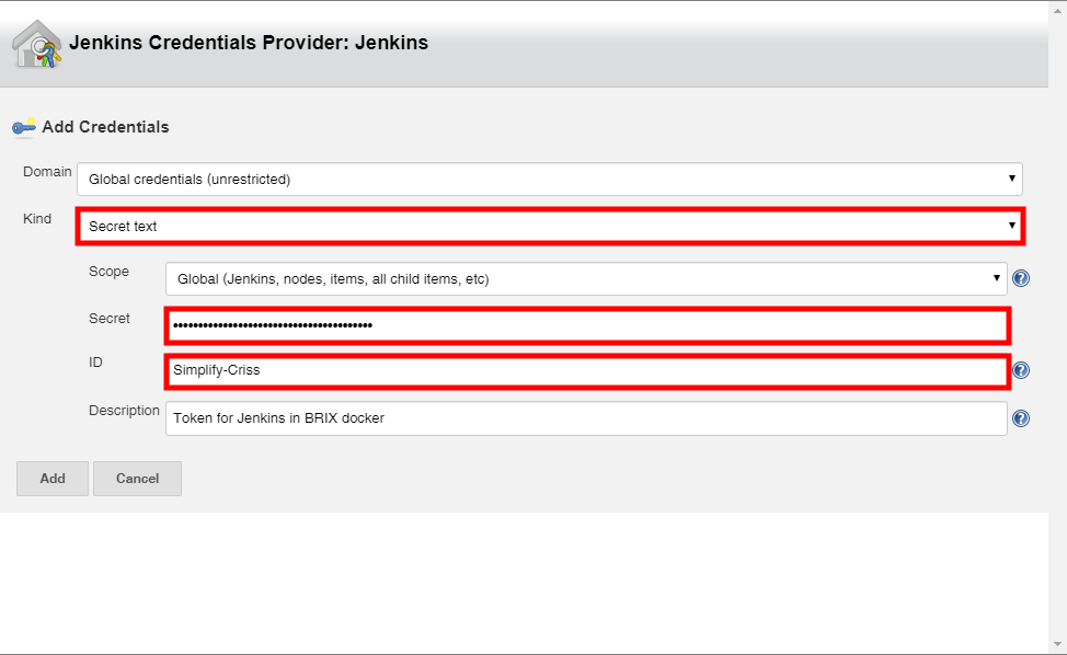 팝업에서 위 처럼 입력합니다. Secret text 를 선택하고 Secret 영역에 잘 입력해주는게 중요합니다. 물론 ID도요.