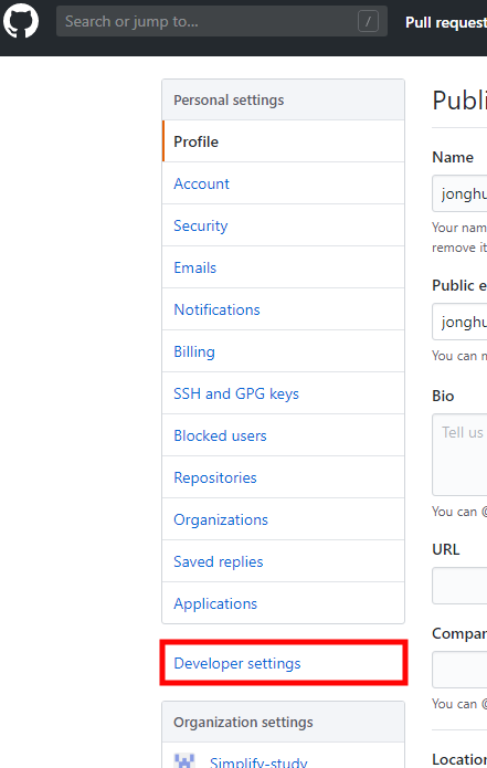 GitHub 홈페이지에 접속, 로그인하여 Settings 로 진입합니다. 그리고 좌측 메뉴에서 아래와 같이 Developer Settings 에 들어갑니다.