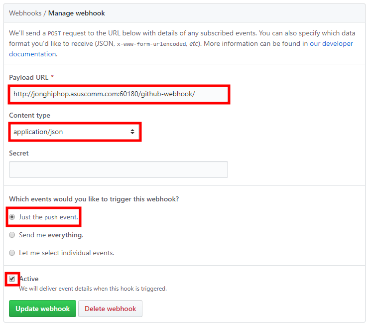 위에서 가장 중요한 부분은 본인의 Jenkins 주소 하위에 /github-webhook/ 를 붙여주어야 한다는 것입니다. 그리고 나머지 설정은 위에서처럼 설정합니다. 저의 경우 Push 할 떄 마다 Hook 를 보내 줄 것이므로 Just the push event 에 체크하였습니다. (저는 이미 생성한 것을 보고 있어 위 처럼 Update ... 버튼이 보이지만, 아마 처음에는 Save, Apply 등이 보일 것입니다.