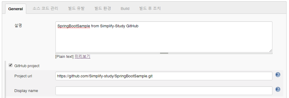 일반 설정들을 해 주고, 아래 부분에 소스 코드 관리 부분까지 이동합니다.