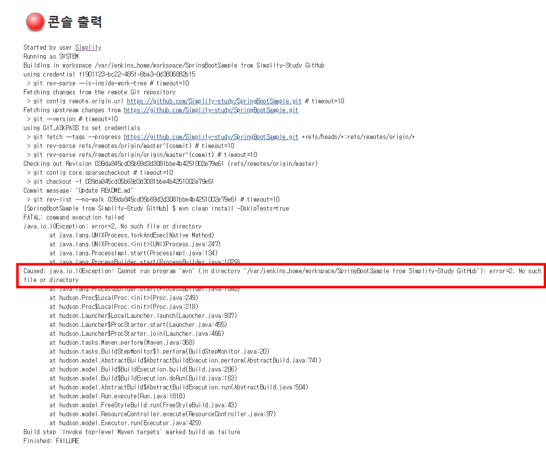 이 경우, 기존에 가지고 있는 maven프로젝트를 빌드하려고 하면 아래와 같은 오류 메시지가 나옵니다. 그리 어렵지 않게, console output만 보고도 충분히 mvn 명령어가 없다는 것을 인지할 수 있습니다.