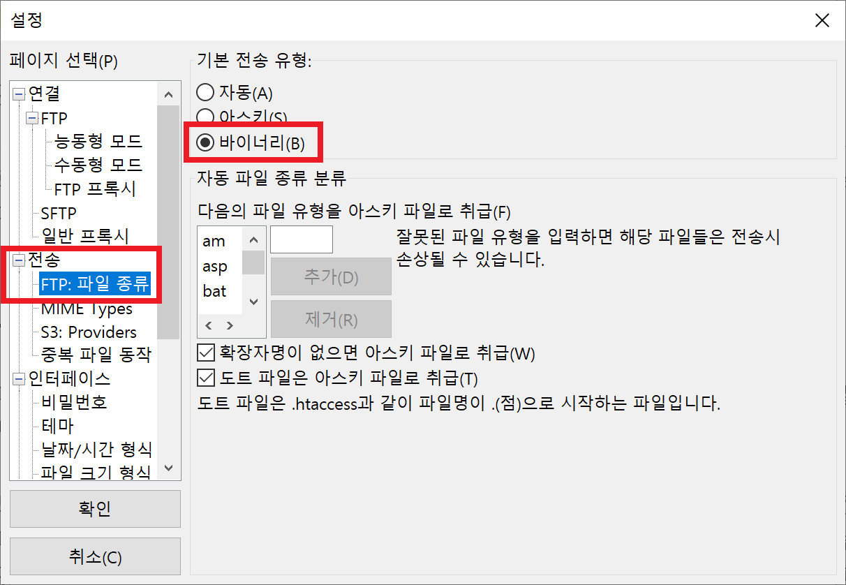 FileZilla의 설정 화면에 진입하고 아래와 같이 전송-FTP: 파일종류 메뉴에서 기본전송유형을 자동이나 아스키에서 바이너리로 변경합니다.
